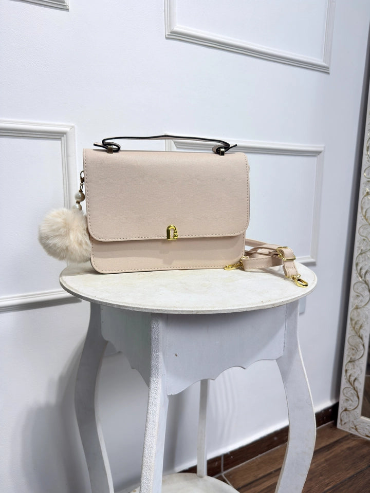 Bolsa estruturada com acabamento sofisticado e detalhe de pingente em pérolas e pompom. Possui alça tiracolo fechada, fechamento com botão imantado e interior dividido com bolso externo com zíper para melhor organização. Perfeita para o dia a dia com um toque elegante.