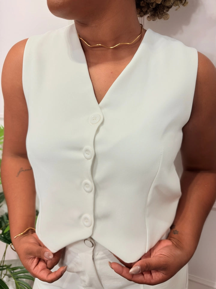 O Colete Mielle possui decote em V que alonga a silhueta e fechamento frontal por botões forrados, trazendo um visual elegante e moderno. O corte estruturado valoriza o corpo com conforto, tornando a peça versátil para composições do casual chic ao look mais refinado.
