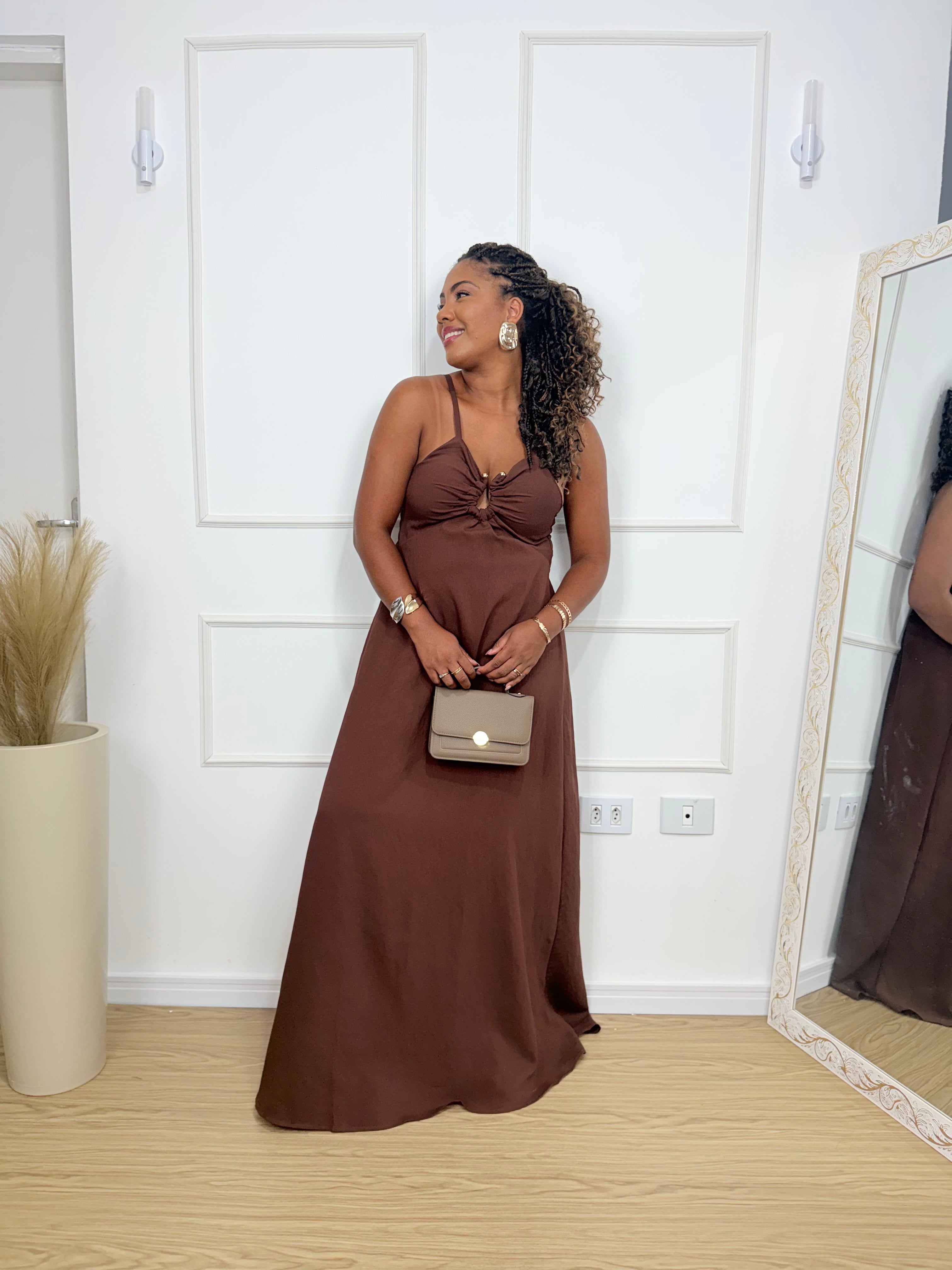 O vestido Balli apresenta alças finas e decote delicado com detalhe franzido no busto, valorizando o colo de forma sutil e feminina. O caimento leve e soltinho proporciona movimento e conforto, enquanto o comprimento longo traz sofisticação e presença ao look.